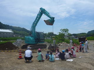 建設機械の能力当てクイズをして建設機械と河川改修工事について、