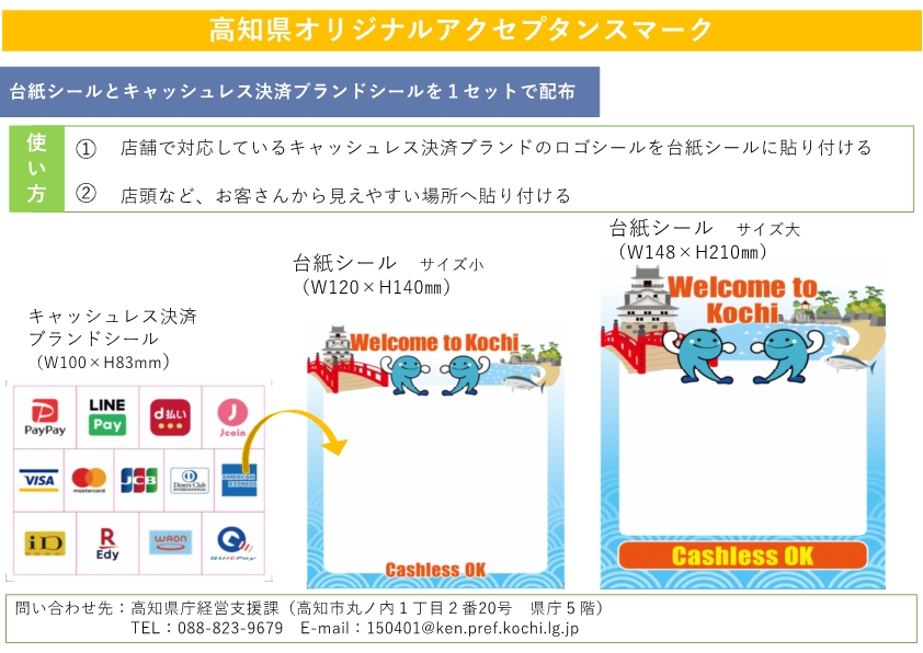 この度、取り組みの一環として、県内全域でキャッシュレス化の普及促進に取り組んでいることをPRする目的で、キャッシュレス決済対応店舗であることを国内外からの観光客や県内消費者等へ分かりやすく情報提供するため、高知県オリジナルアクセプタンスマーク(キャッシュレス決済手段のマークを表示するステッカー)を作成しました。