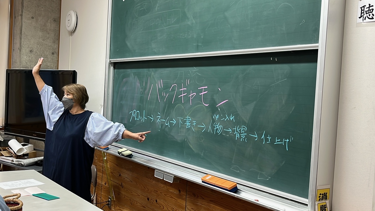 ・先生のまんが原稿や黒板に描く滑らかなキャラクターに驚いた。