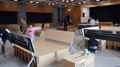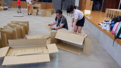「巨大地震注意」の発令により、内容を「海編」から「防災避難所編」に変更にて行いました。午前中は避難所生活について考え、午後からは自分たちのパーソナルスペースをつくり、夜はそのパーソナルスペースで、自分で組み立てた段ボールベットで就寝しました。2日目は、漂流物を使っての工作を行った後、センター内の備蓄品倉庫見学を行いました。