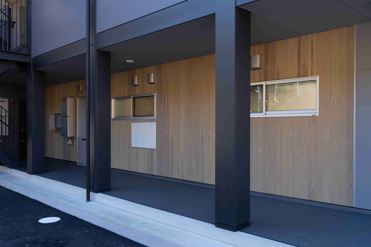 いの町集合住宅 X-ino(シーノ)は、CLTパネル工法による木造4階建集合住宅で、工法の標準化による低コスト化を実現したCLT3.6mモジュールシステムを採用しています。構造を木造化することで木材利用を進め、林業・木材産業の活性化と脱炭素社会に向けて貢献できる集合住宅です。外壁と外構の一部にも木材を使い、メンテナンス性を保ちながら、木の魅力を表現したデザインとなっています。