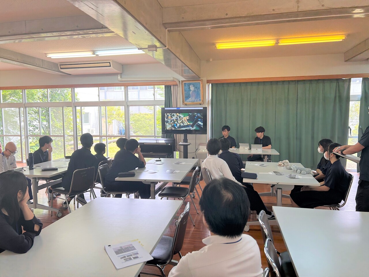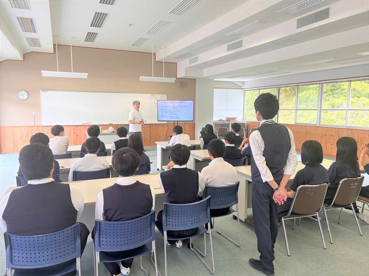 1時間目の座学では中央西土木事務所が建設業の概要説明を行いました。