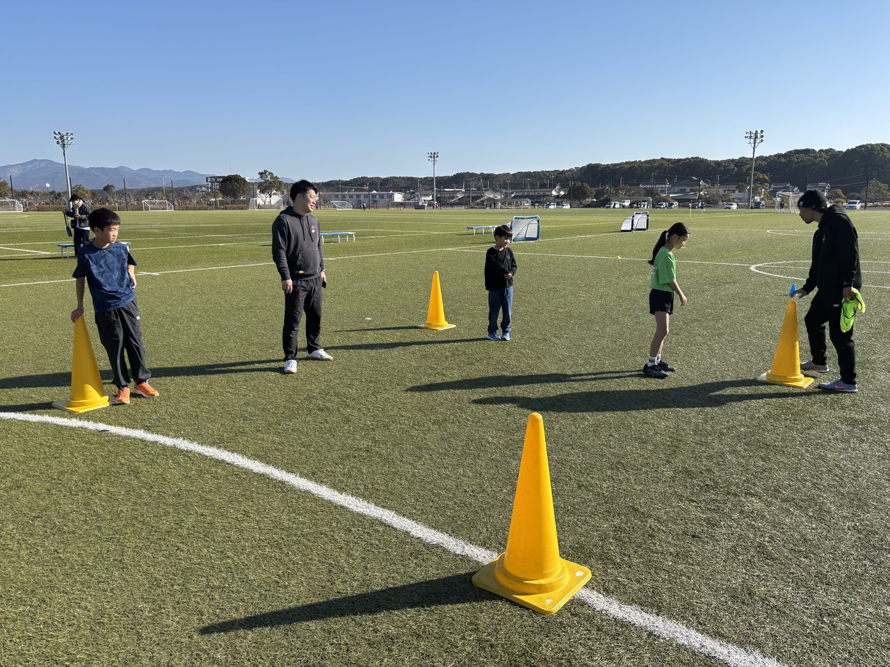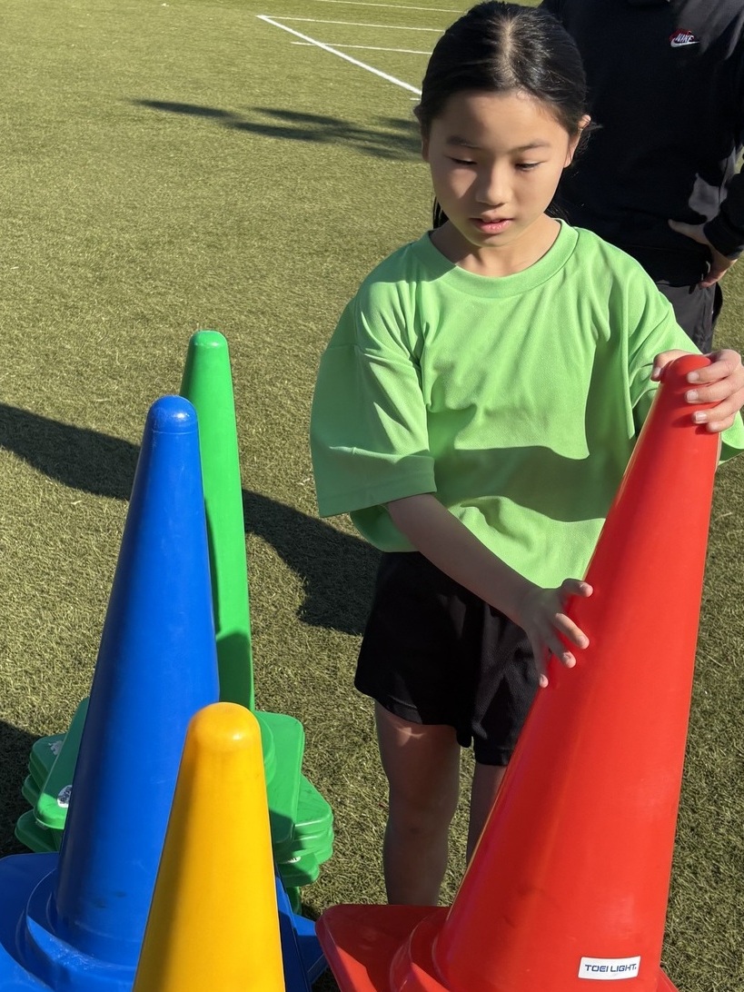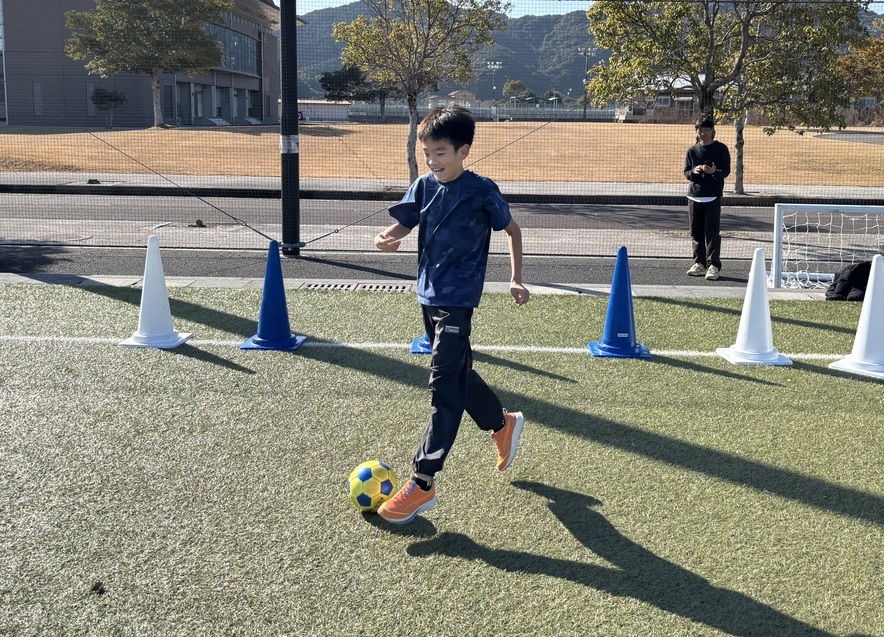 他にも、三角コーンにボールを蹴って当て、相手の陣地により多くの三角コーンを置く勝負もしました。